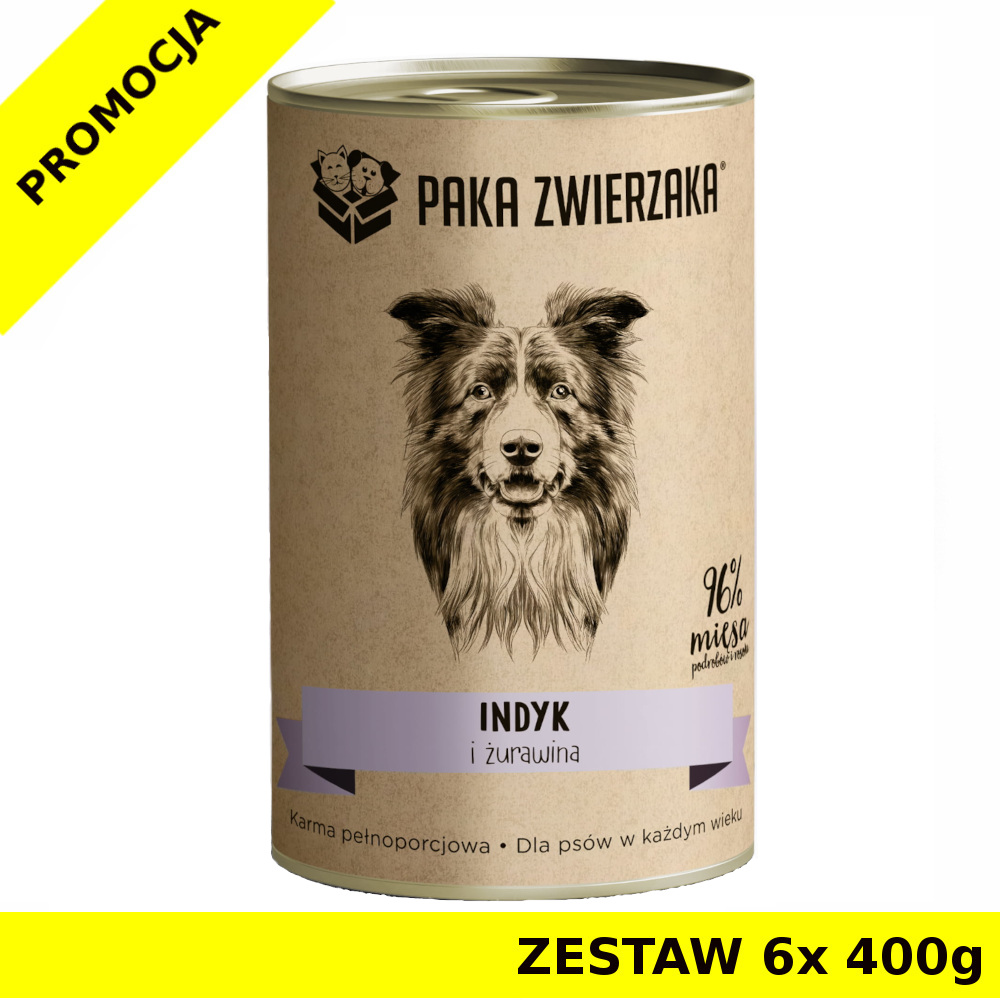 PAKA ZWIERZAKA - INDYK Z ŻURAWINĄ 400G - zestawNaturalna karma mokra jest kompletnym i zbilansowanym posiłkiem dla psiaków w każdym wieku. Zawiera aż 96% indyka z rosołem! Przygotowana z najwyższej jakości świeżego i soczystego mięsa i podrobów. Bogata w składniki odżywcze i wysoko przyswajalne źródła białka zwierzęcego. Dzięki zastosowaniu jednego rodzaju białka jest to odpowiednia karma do zmniejszenia ryzyka alergii i nietolerancji pokarmowej.