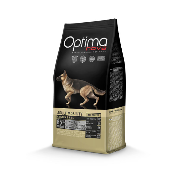 Optimanova Adult Mobility Chicken & Rice – zawiera 65% mięsa, karma holistyczna klasy super premium przeznaczona dla dorosłych psów ciężko pracujących. Tworzona tylko z naturalnych składników pozyskiwanych lokalnie. W produkcji wykorzystywana jest duża ilość świeżego mięsa. Unikalny, niskotemperaturowy proces produkcji minimalizuje denaturację białek, straty witamin i soli mineralnych. Karma monoproteinowa, znacząco ogranicza ryzyko alergii. Zawarte w niej składniki takie jak selen działają antynowotworowo oraz przyczyniają się do rozwoju układu nerwowego, zwiększają wydolność układu odpornościowego i układu krążenia.