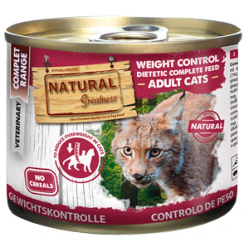 Natural Greatness Weight Control to kompletna, hipoalergiczna mokra karma bez zbóż, przeznaczona dla młodych i dorosłych kotów z nadwagą, otyłością lub cierpiących na cukrzycę, zapalenie okrężnicy, zaparcia lub hiperlipidemię związaną z nadwagą. Ta karma nie jest odpowiednia dla kotek w ciąży lub karmiących oraz dla kociąt. Zaleca się stosowanie tego produktu do czasu, aż zwierzę osiągnie idealną wagę. W przypadku kotów z cukrzycą należy stosować tę karmę przez sześć miesięcy. Po tym okresie należy dokonać oceny przed podjęciem decyzji o ewentualnym przedłużeniu diety.