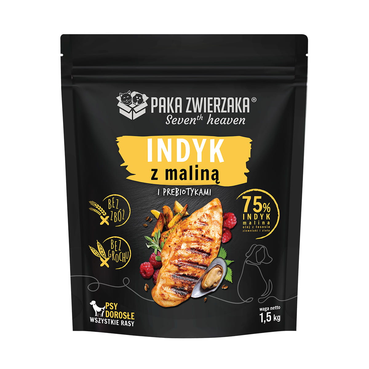 - 75% mięsa indyczego, malin, oleju z łososia, ziemniaków oraz ziół