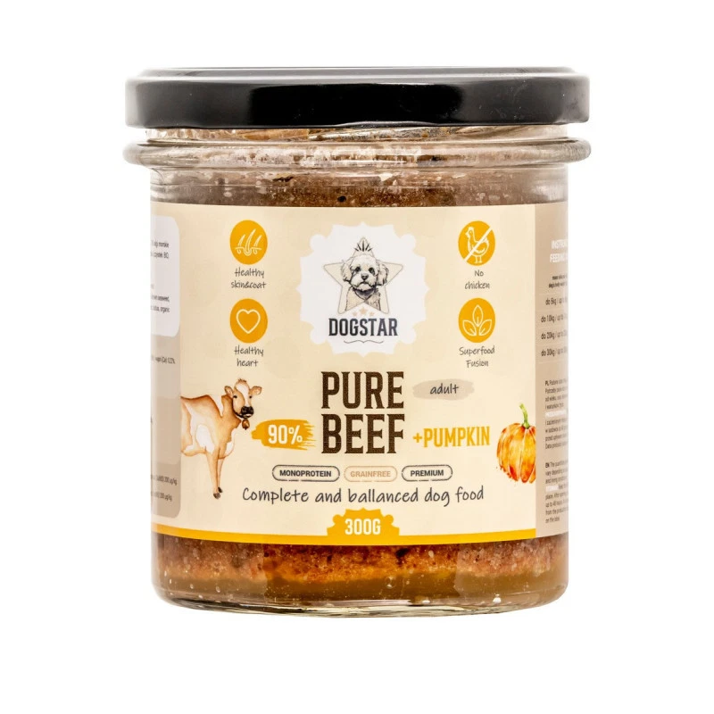 Twój pies zasługuje na posiłek, który nie tylko syci, ale także wspiera jego dobre samopoczucie każdego dnia. Dogstar – Wołowina z cukinią to receptura pełna świeżego mięsa i naturalnych składników, bez zbóż i sztucznych dodatków. To czysta, prosta karma, którą możesz podać z dumą – prosto ze słoika!