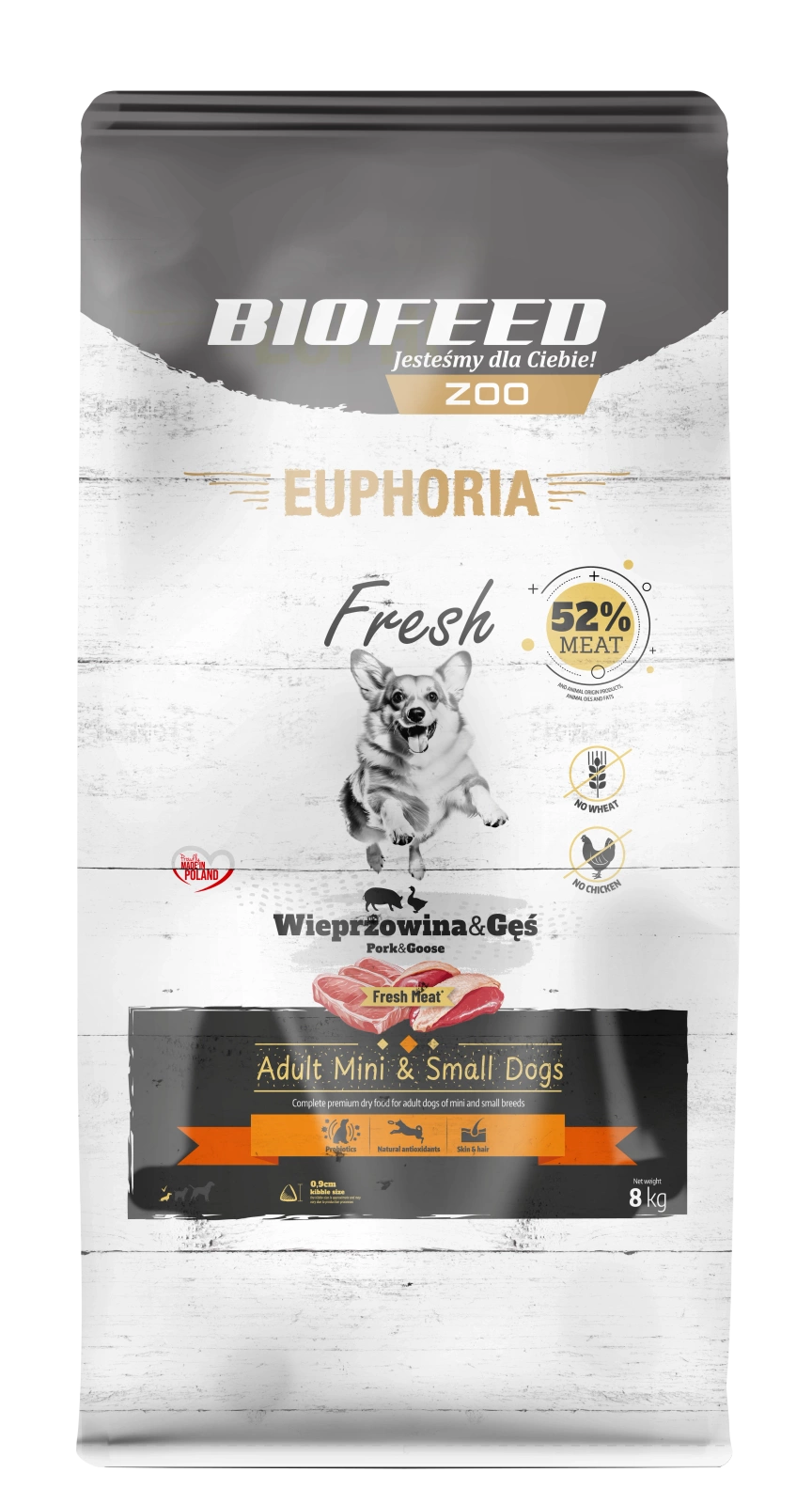 Euphoria Fresh Meat karma sucha dla psów dorosłych Wieprzowina z Gęsią XS/S 8kg