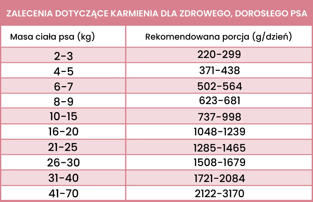 Dostosuj ilość karmy do wieku, masy i poziomu aktywności psa. Zawsze zapewnij dostęp do świeżej wody.