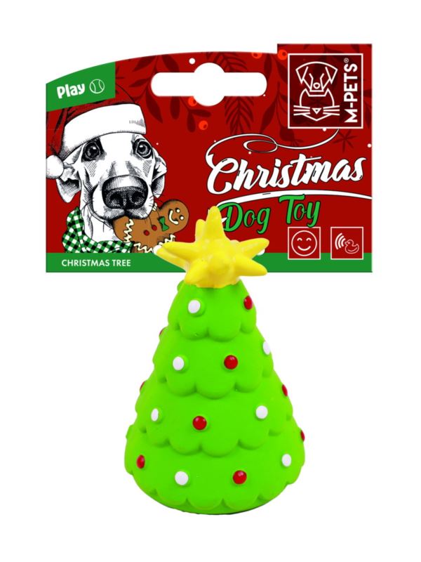 Świąteczna zabawka dla psa marki M-PETS – kształt choinki, lateksowa konstrukcja, piszczałka – idealna na radosne chwile w okresie zimowym.
