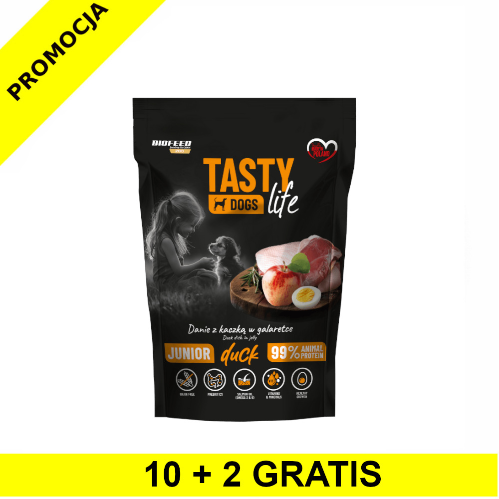 10+2 GRATIS Tasty Dogs Life karma mokra dla szczeniąt danie w galaretce Junior Kaczka 500g saszetka
