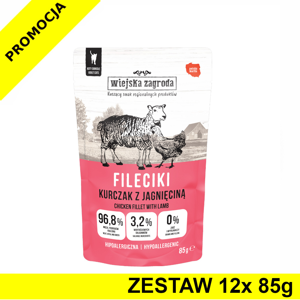 Wiejska Zagroda karma mokra dla kota fileciki Kurczak z Jagnięciną to idealna mokra karma dla kotów dorosłych. Dzięki wysokiej zawartości mięsa i delikatnej strukturze filecików doskonale sprawdzi się zarówno dla wybrednych kotów, jak i tych z wrażliwym układem pokarmowym.