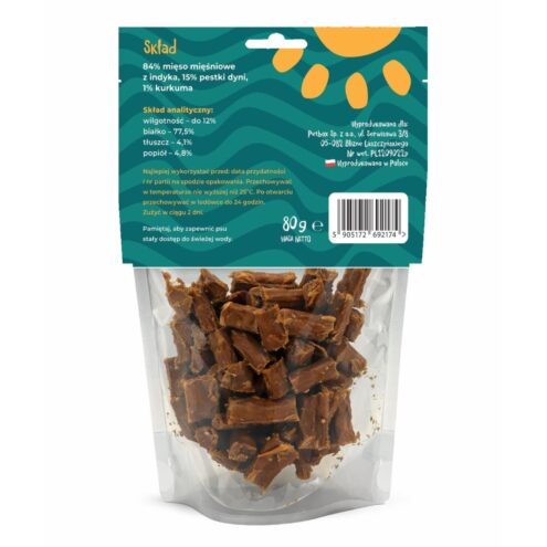 Mr. Bro Air Dried z indyka to mięsna nagroda zaprojektowana z myślą o skutecznym treningu. Aż 84% mięsa mięśniowego zapewnia intensywny aromat i wysoką smakowitość, a suszenie powietrzem w niskiej temperaturze pomaga zachować naturalne walory produktu bez zbędnych dodatków.