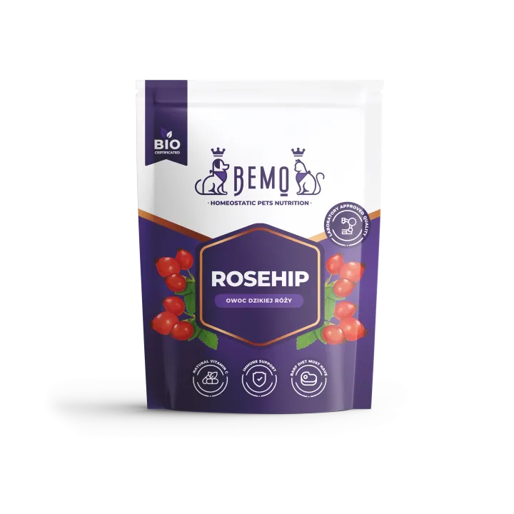 Bemo Rosehip to drobno zmielony owoc dzikiej róży, całkowicie pozbawiony gniazd nasiennych i drażniących włosków. Surowiec pochodzi z naturalnych upraw bez pestycydów i nawozów chemicznych. To funkcjonalny dodatek do diety psów i kotów, szczególnie polecany przy obniżonej odporności, problemach ze stawami oraz w diecie surowej i gotowanej.