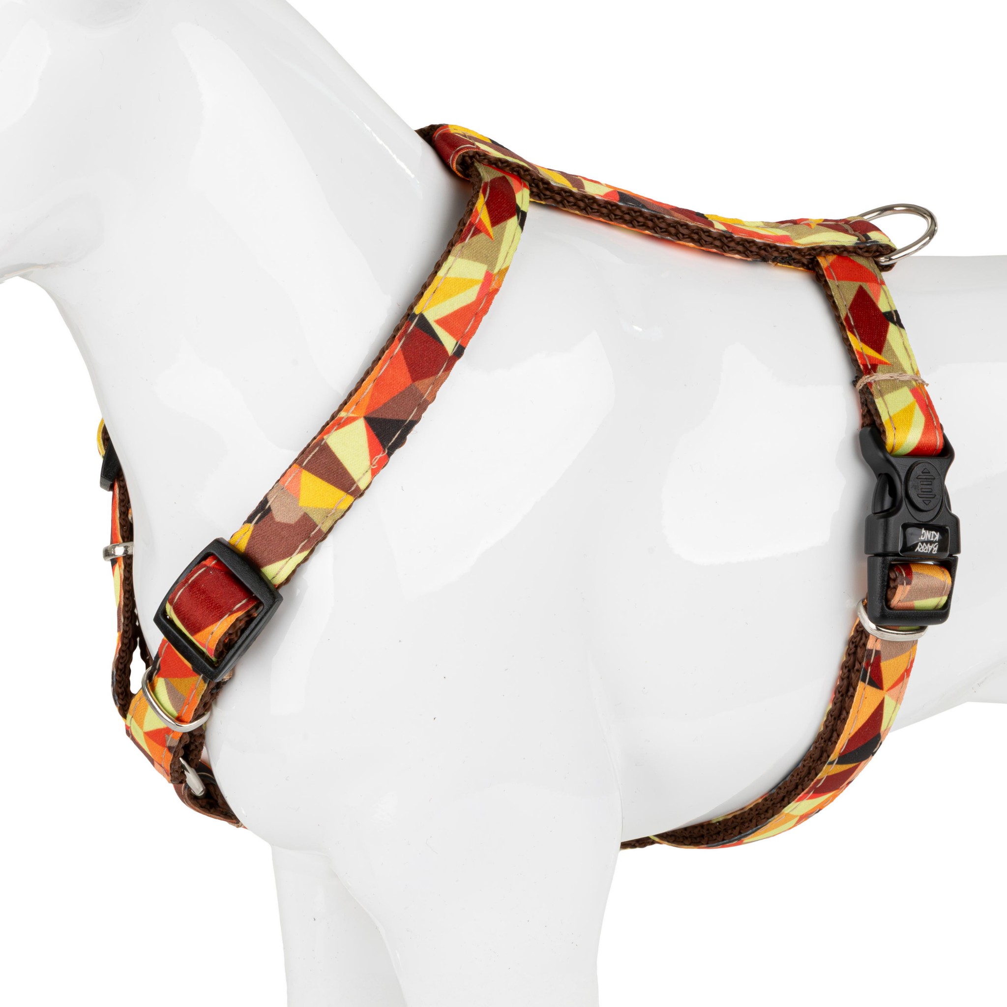 Jesienne spacery mają swój niepowtarzalny klimat – ciepłe barwy, miękkie światło i spokojniejszy rytm dnia. Szelki Barry King „Jesień” przenoszą tę atmosferę do codziennych wyjść z pupilem. Mozaika kształtów w odcieniach żółci, pomarańczy, czerwieni i bordowego kontrastuje ze stonowaną brązową taśmą oraz czarnym podszyciem, tworząc estetyczną, dopracowaną kompozycję. To model, który łączy funkcjonalność z dopracowanym wzornictwem.