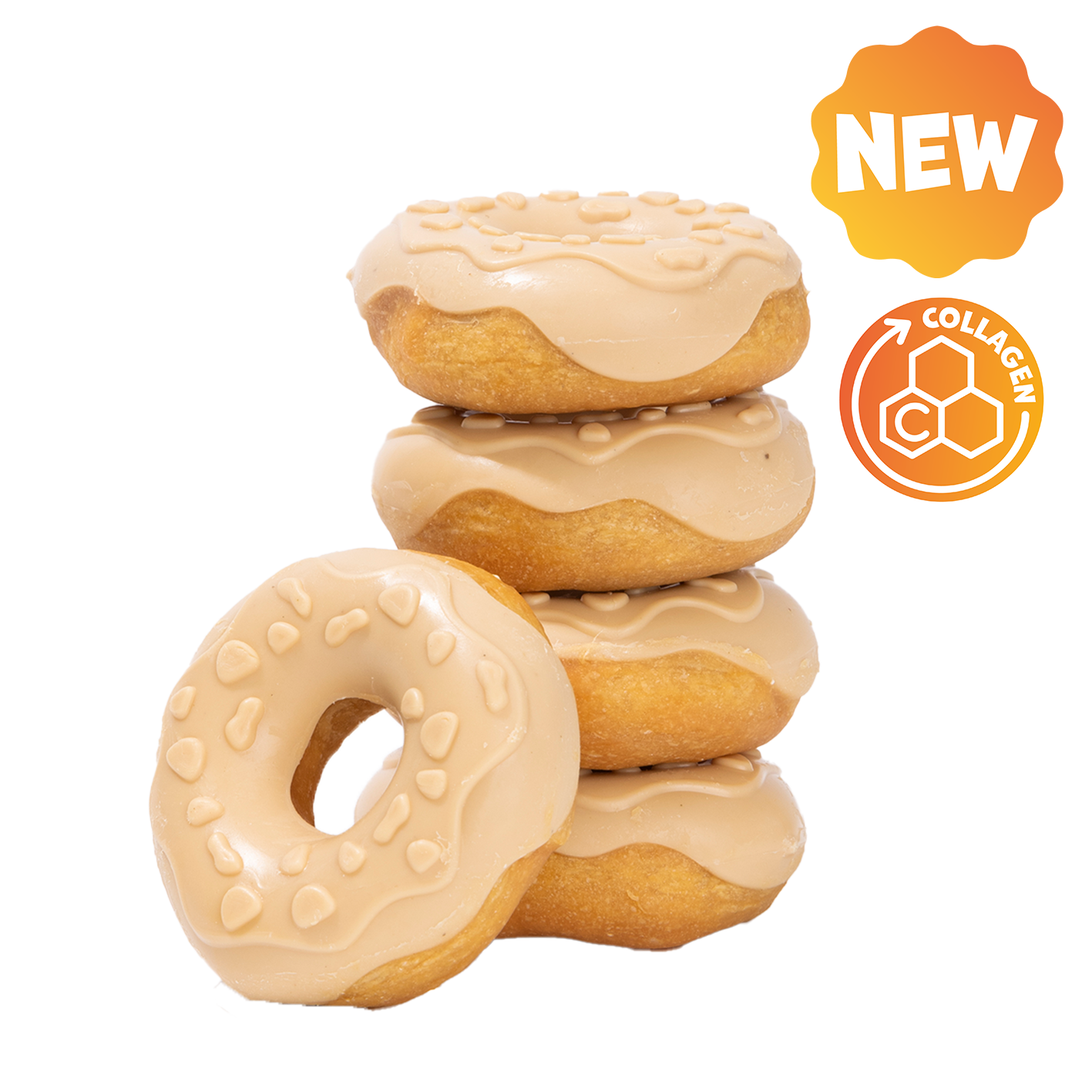 Twardy, mięsisty gryzak dla psa w kształcie pączka z kurczakiem, kokosem i kolagenem – smakowita przekąska, która zajmuje psa na dłużej i wspiera codzienną aktywność żucia 🐶