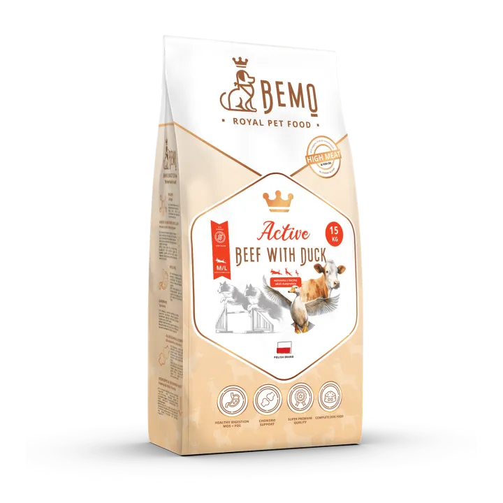 Pies aktywny potrzebuje czegoś więcej niż zwykłego posiłku. Potrzebuje karmy, która nadąży za jego tempem, wesprze mięśnie, stawy i regenerację, a jednocześnie będzie smakować od pierwszego chrupnięcia. Bemo Active to receptura oparta na połączeniu wołowiny i kaczki, wzbogacona o lekkostrawny ryż, składniki funkcjonalne oraz kompleks chondroprotekcyjny. Dzięki temu codzienna dieta psa pracującego lub sportowego może być dobrze zbilansowana, sycąca i dopasowana do jego realnych potrzeb.
