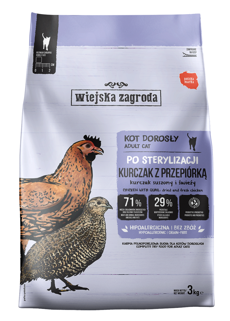 Po zabiegu sterylizacji lub kastracji potrzeby żywieniowe kota mogą się zmienić. Właśnie wtedy szczególnie ważna staje się odpowiednio zbilansowana dieta, która pomaga utrzymać zgrabną sylwetkę, wspiera metabolizm i jednocześnie dostarcza dużej ilości wartościowego białka. Wiejska Zagroda Kurczak z przepiórką to receptura oparta na mięsie i funkcjonalnych dodatkach, dzięki którym codzienny posiłek wspiera dobre samopoczucie, komfort trawienny i zdrowy wygląd kota.